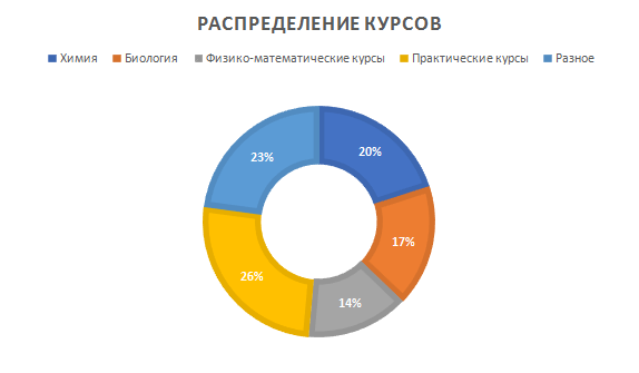 В сезоне 2019 года школьники изучили 38 предметов различной тематики, начиная от традиционных: органической, общей, неорганической и аналитической химии, - заканчивая религиоведением и травами. Ниже представлено количественное соотношение курсов по их направленности.