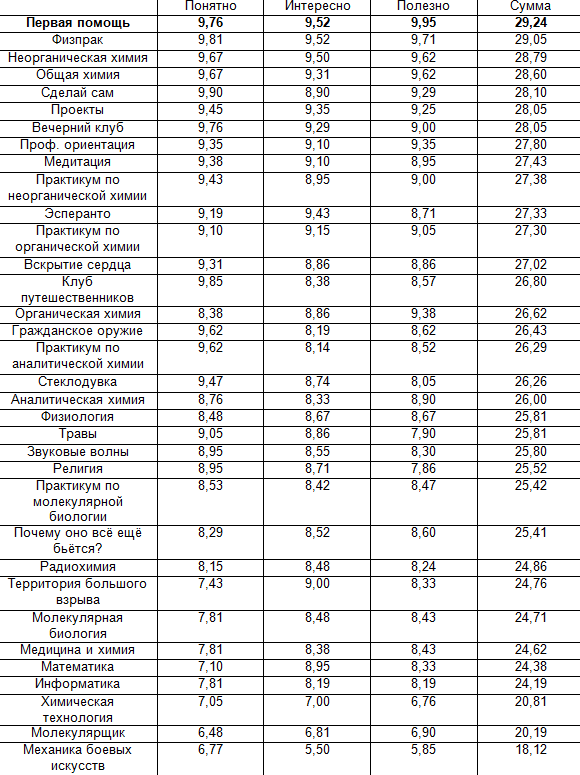В конце сезона каждому школьнику было предложено оценить курсы по критериям «понятно, интересно, полезно» по десятибалльной шкале. Среднеарифметические значения приведены в таблице ниже. В этом году ребята поставили наивысшую оценку курсу «Первая помощь», который провела наш доктор Маша Веселовская. На занятии дети узнали, как ставить внутримышечные уколы, как накладывать жгут и другие жизненно необходимую информацию для того, чтобы первая помощь не тала последней. Вторую позицию занимает «Физпрак». На этом занятии ребят научили всему что касается подготовки дров для самых ярких и теплых костров. Среди продолжительных курсов лидирующую позицию занимает курс «Неорганическая химия», который ежегодно читает Евгений Трубицын. Евгений преподает химию на профильном уровне в ГБОУ школа №218, а также является составителем олимпиадных задач и человеком с хорошим чувством юмора. Наверное, где-то здесь и кроется секрет успеха.